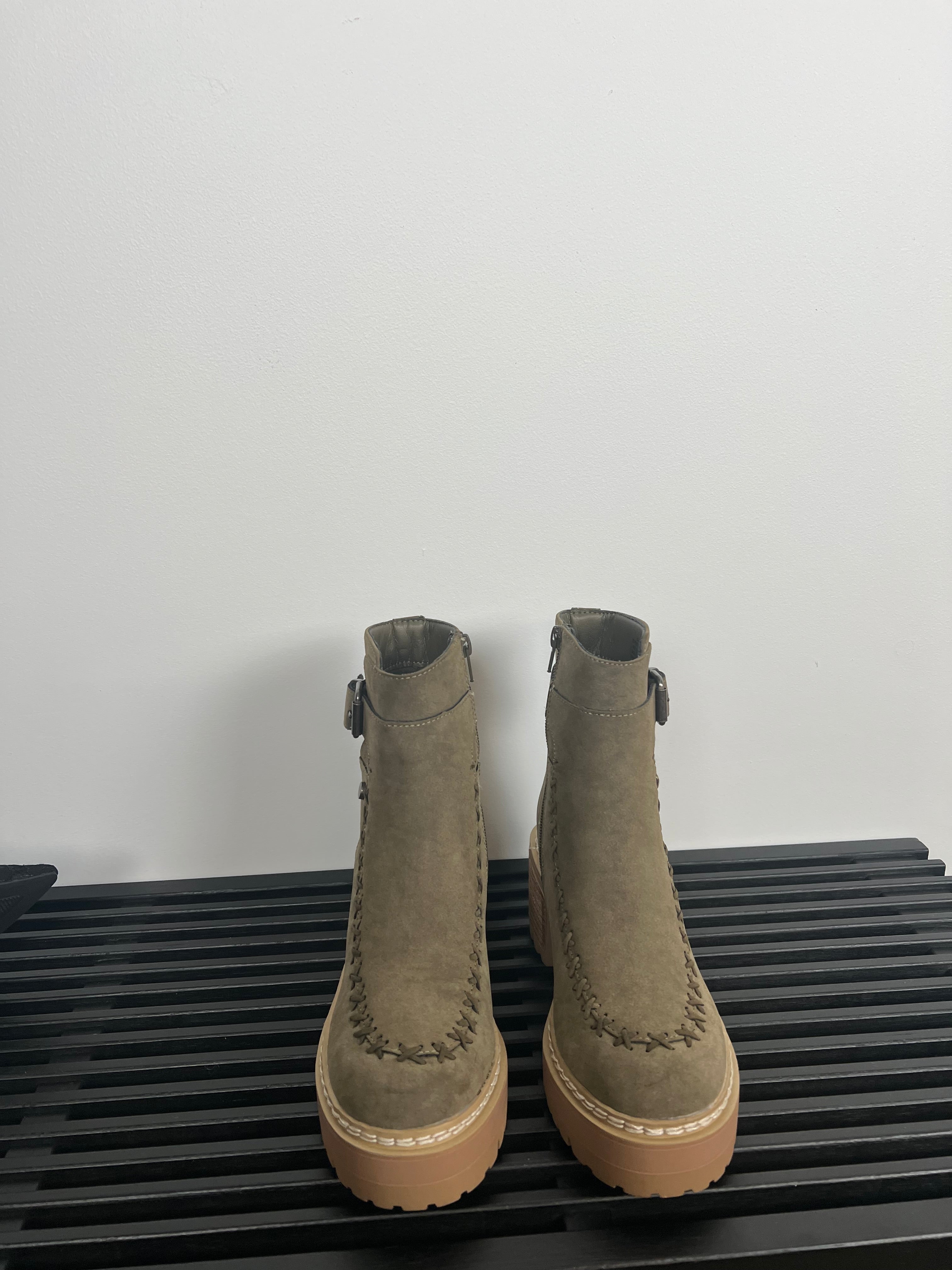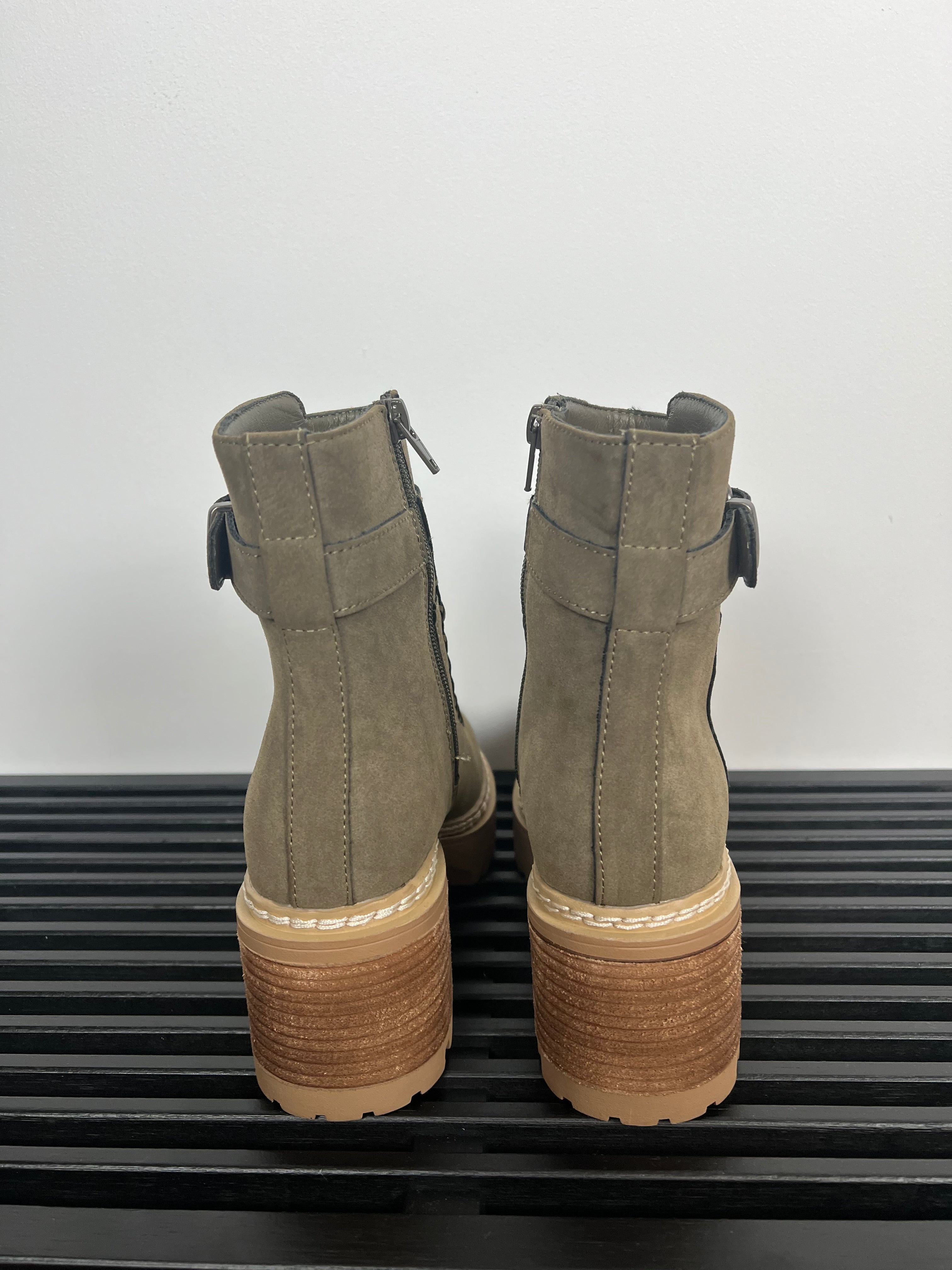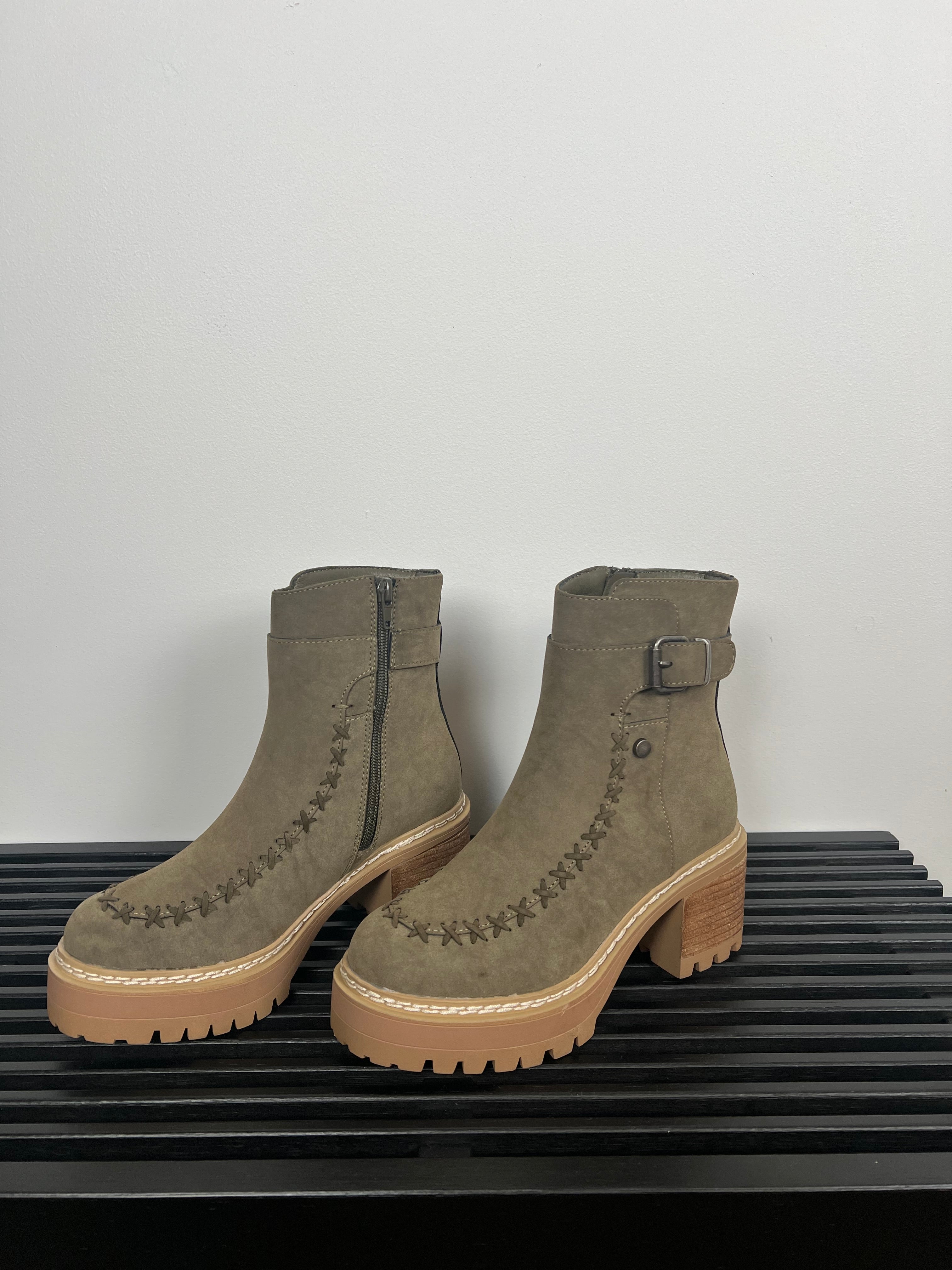 These taupe platform boots bring together bold edge and cozy sophistication. Designed with a chunky wooden block heel, contrast stitching, and subtle buckle detailing, they add instant personality to any look. The soft suede-like texture and unique cross-stitch trim make them a standout statement piece while staying effortlessly wearable all season long.