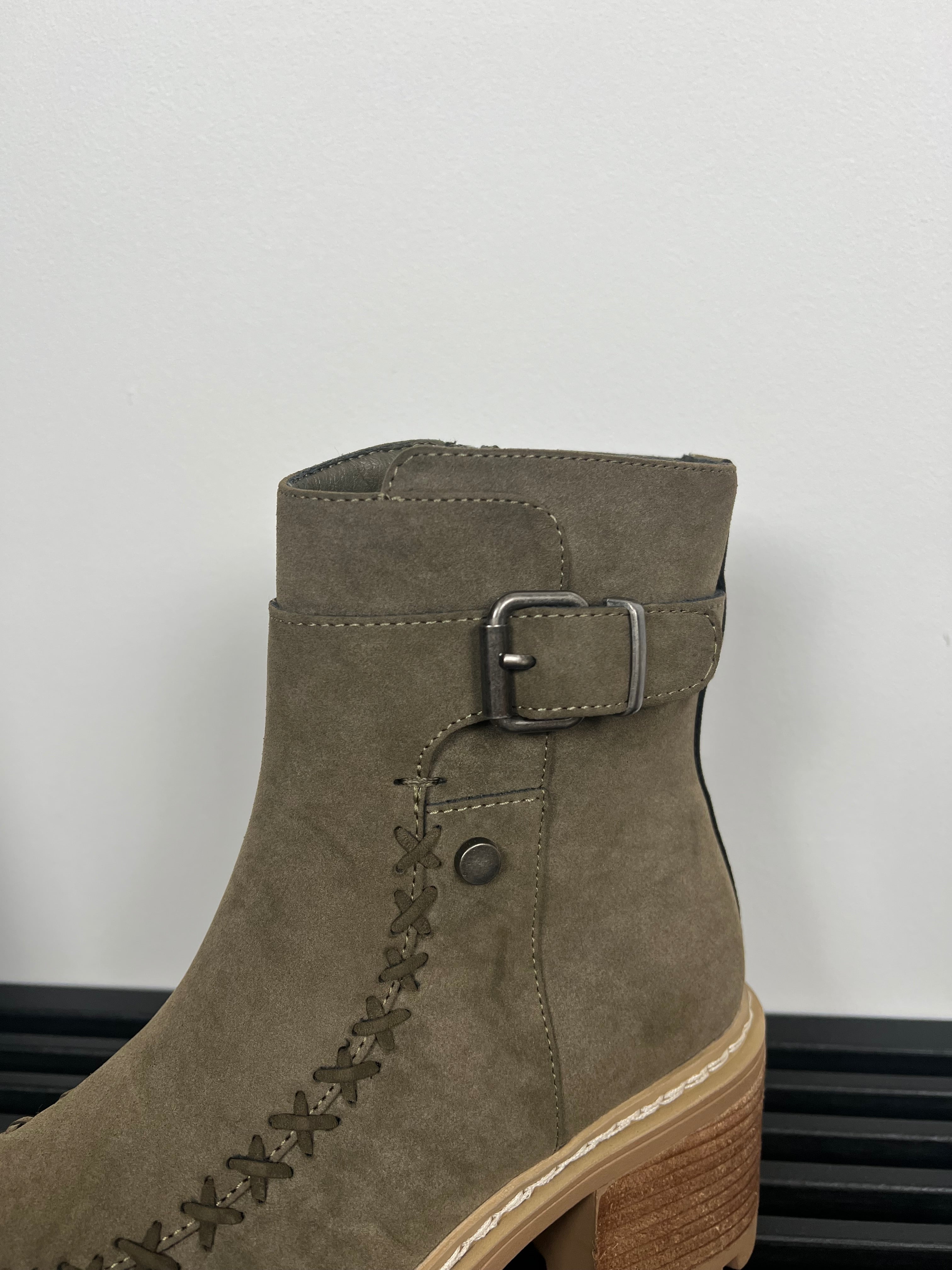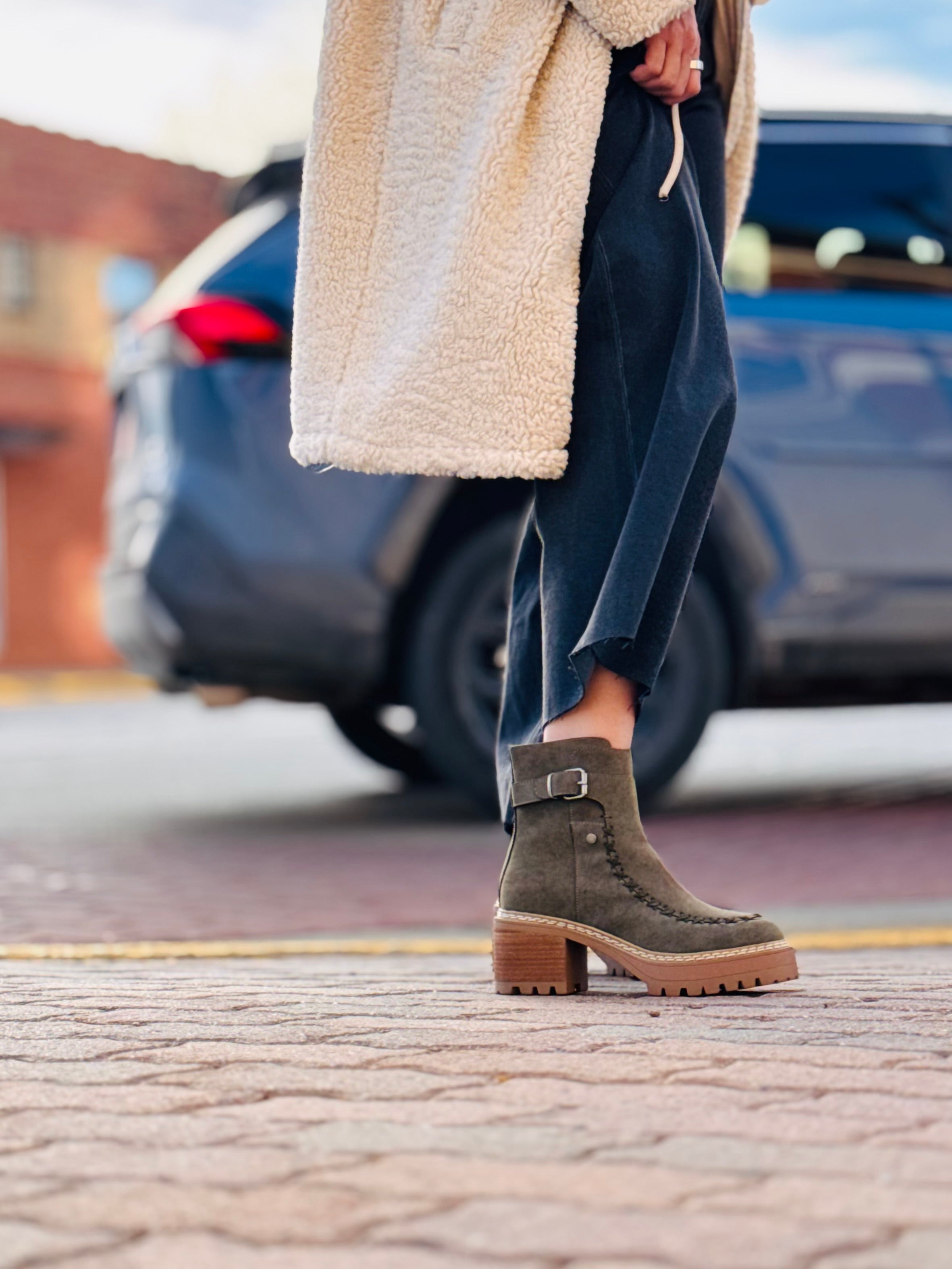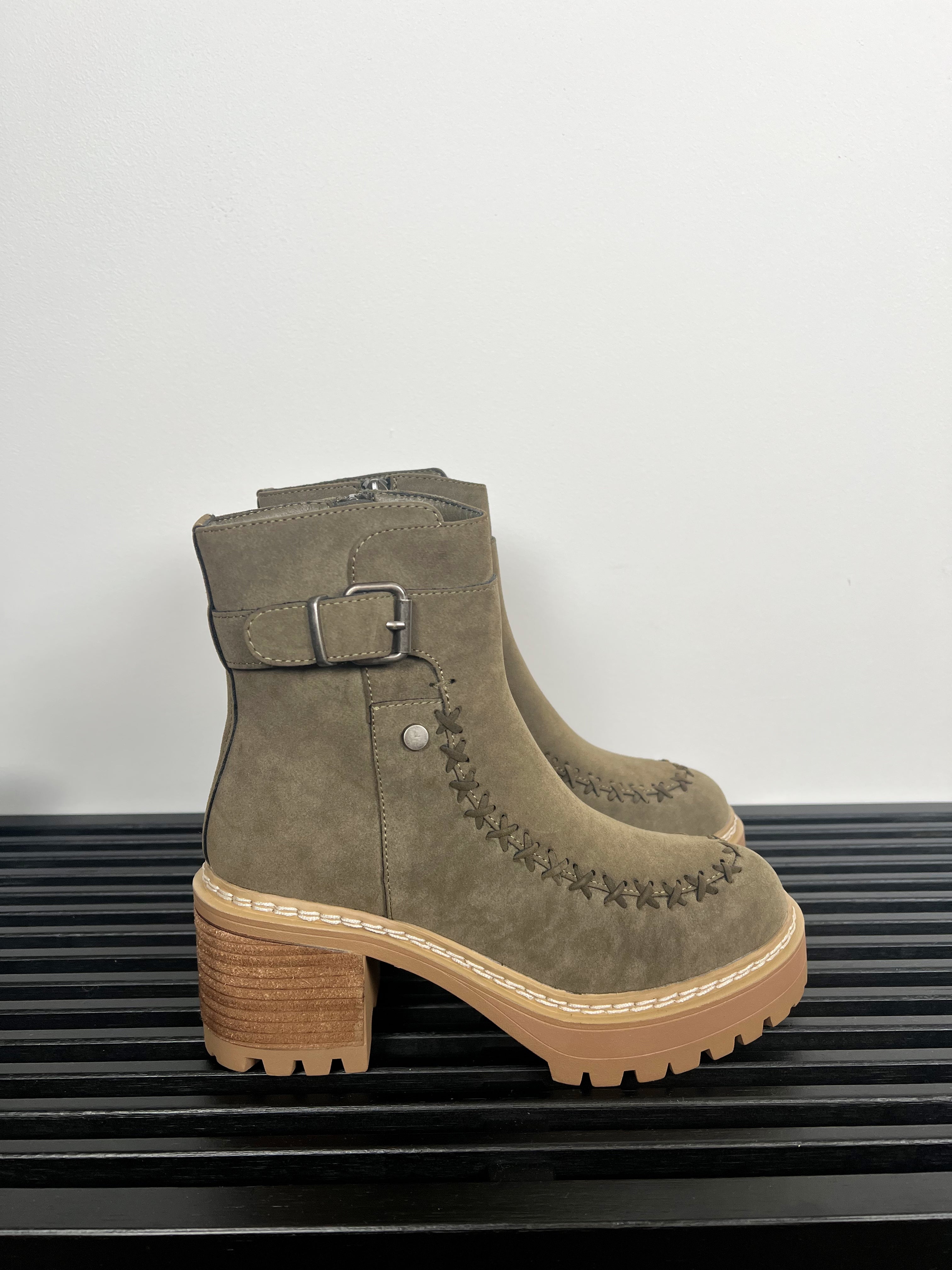 These taupe platform boots bring together bold edge and cozy sophistication. Designed with a chunky wooden block heel, contrast stitching, and subtle buckle detailing, they add instant personality to any look. The soft suede-like texture and unique cross-stitch trim make them a standout statement piece while staying effortlessly wearable all season long.