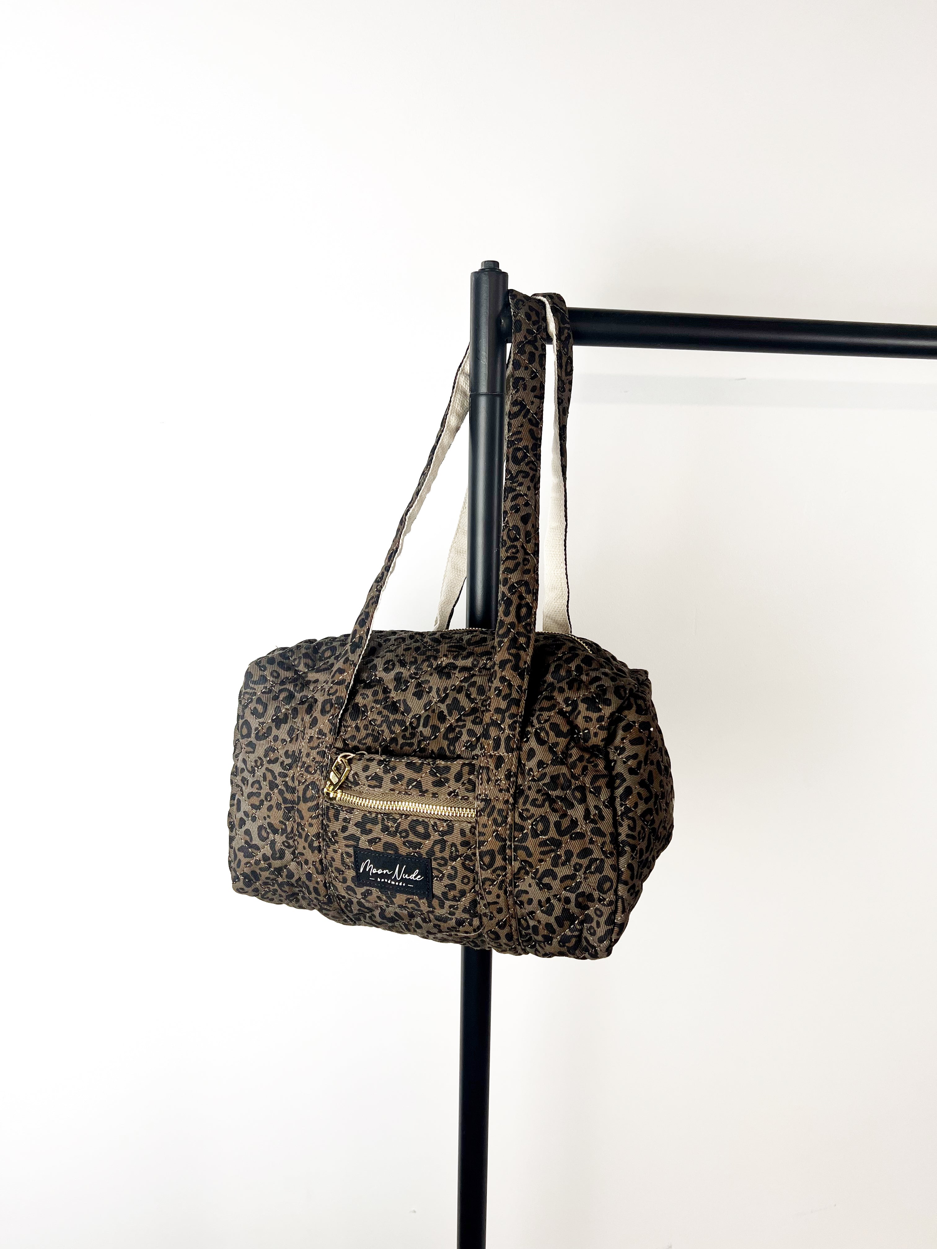 Take your essentials in style with this fierce little mini duffel. Featuring a gorgeous muted leopard print, soft quilted texture, and a sleek gold zipper, this bag brings just the right amount of edge to your everyday routine. The compact size is perfect for quick gym trips, travel carry-ons, work days, or mom-life on the go—while still offering plenty of space inside.
