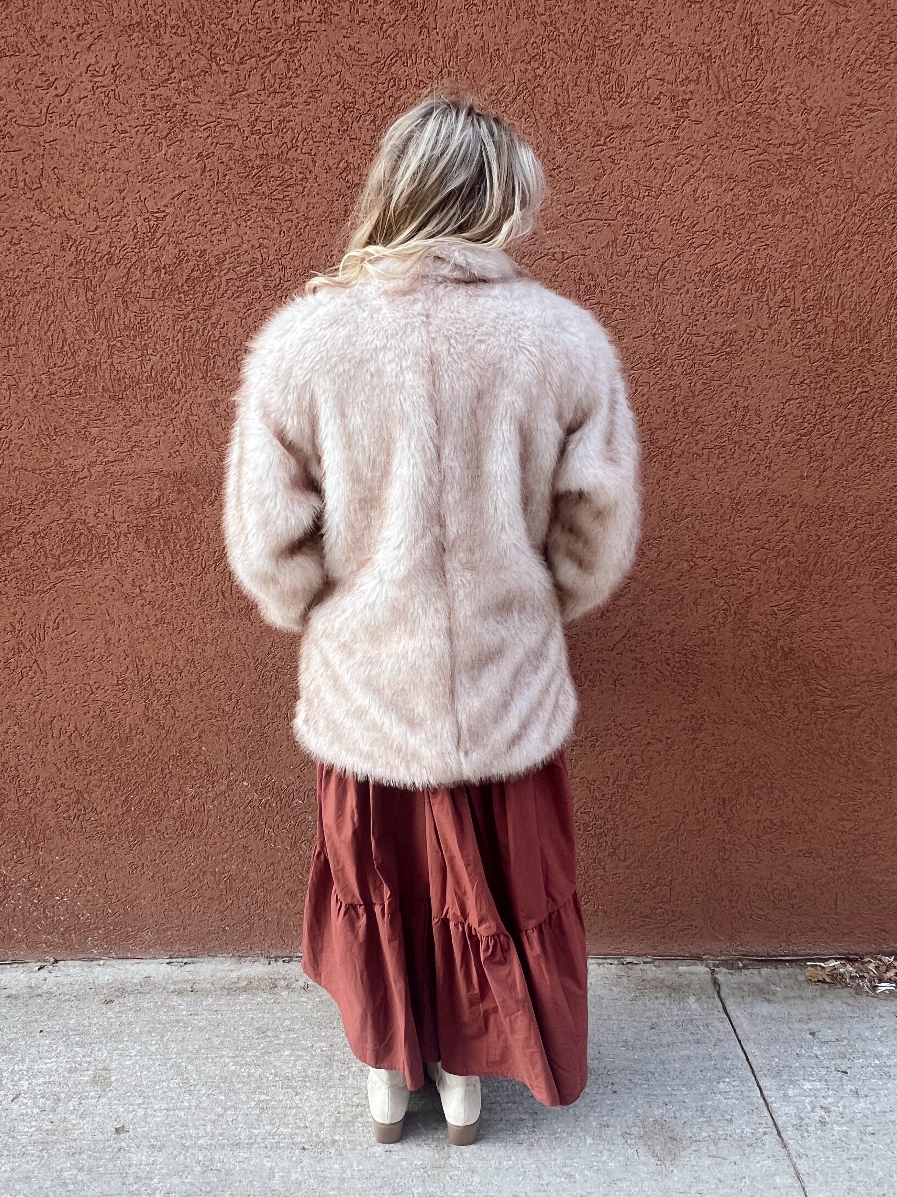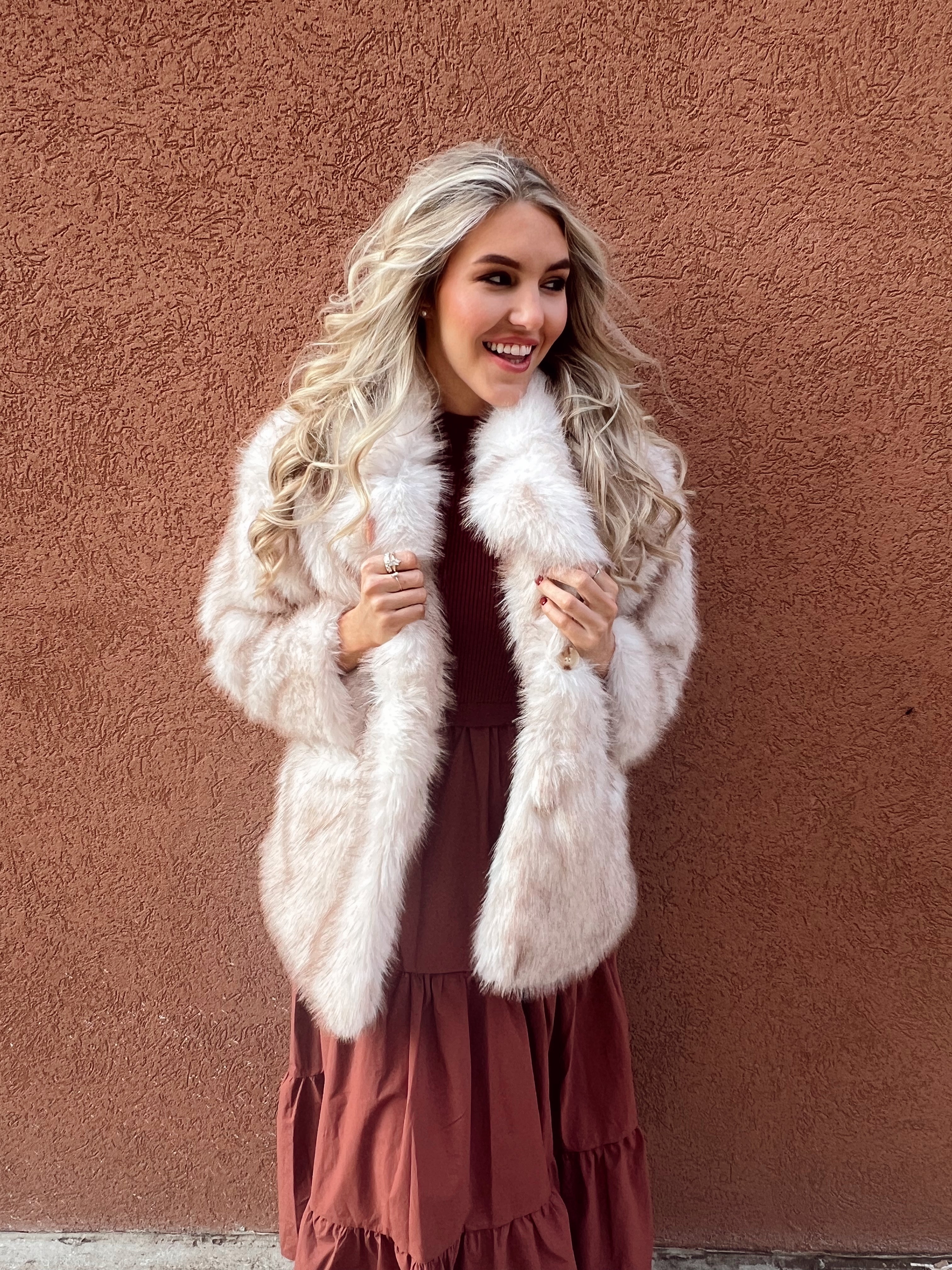 Meet the coat that instantly elevates every winter moment. This luxe faux-fur jacket brings all the glam without sacrificing warmth. The soft blush-cream tone feels feminine and modern, while the plush texture gives you that high-end, cozy-chic vibe your wardrobe has been craving. Effortless to dress up or down, this statement piece pairs perfectly with dresses, denim, and everything in between. The kind of coat that makes you feel put-together the second you slip it on—warm, glamorous, and totally Saucy Blonde approved.