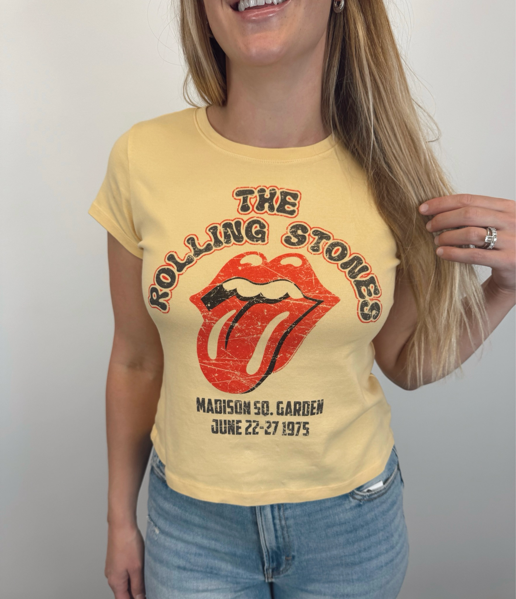 This Rolling Stones baby tee brings vintage vibes-- featuring a soft, comfortable fit and a classic logo that never goes out of style. Pair it with denim, leggings, or a skirt!