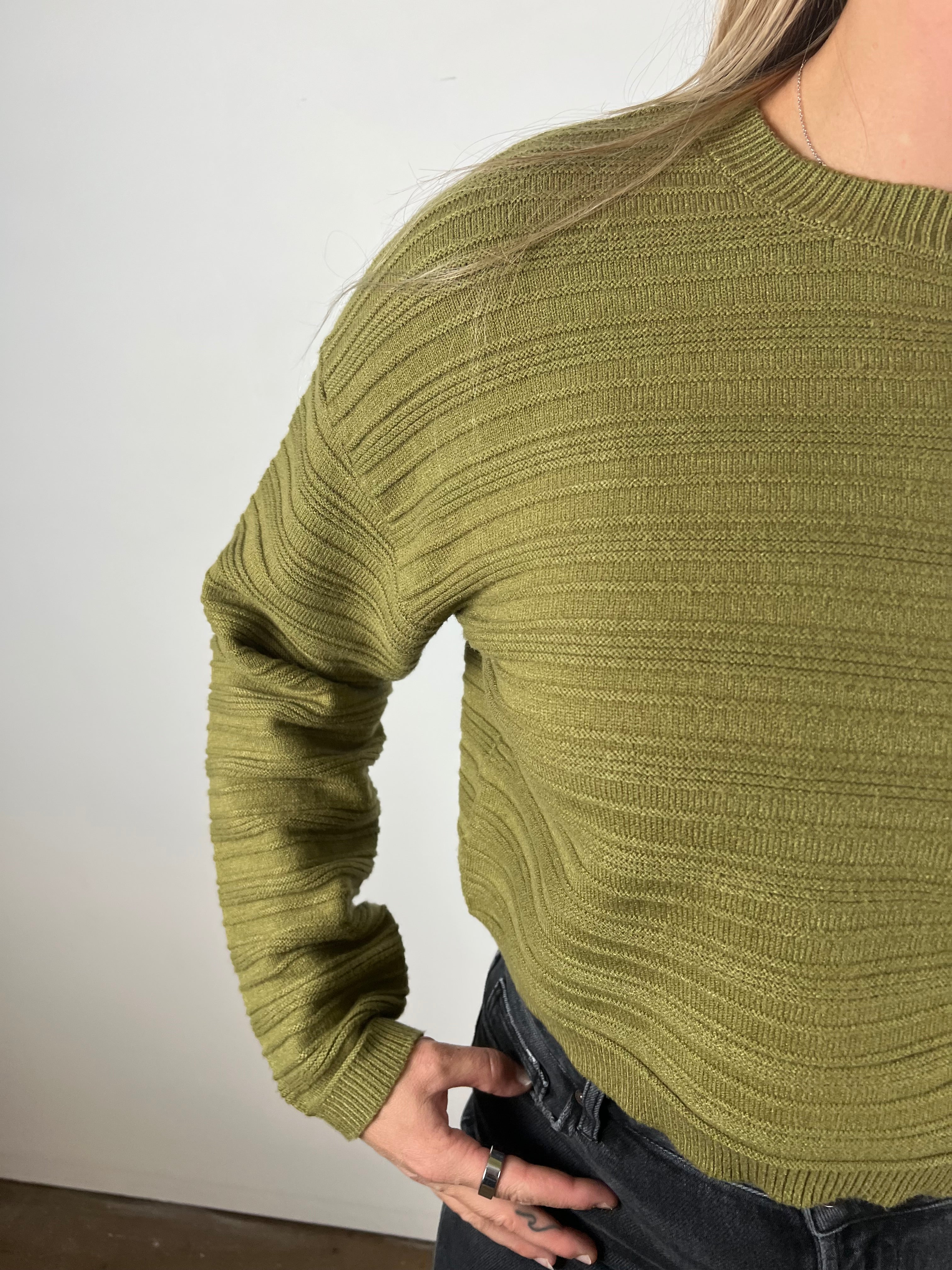This olive textured knit sweater is the definition of laid-back chic. With a soft ribbed pattern, relaxed fit, and cropped length, it's an easy everyday piece that pairs perfectly with your favorite denim. Dress it up with gold jewelry or keep it casual with sneakers - either way, it's your new go-to for cozy, effortless style.