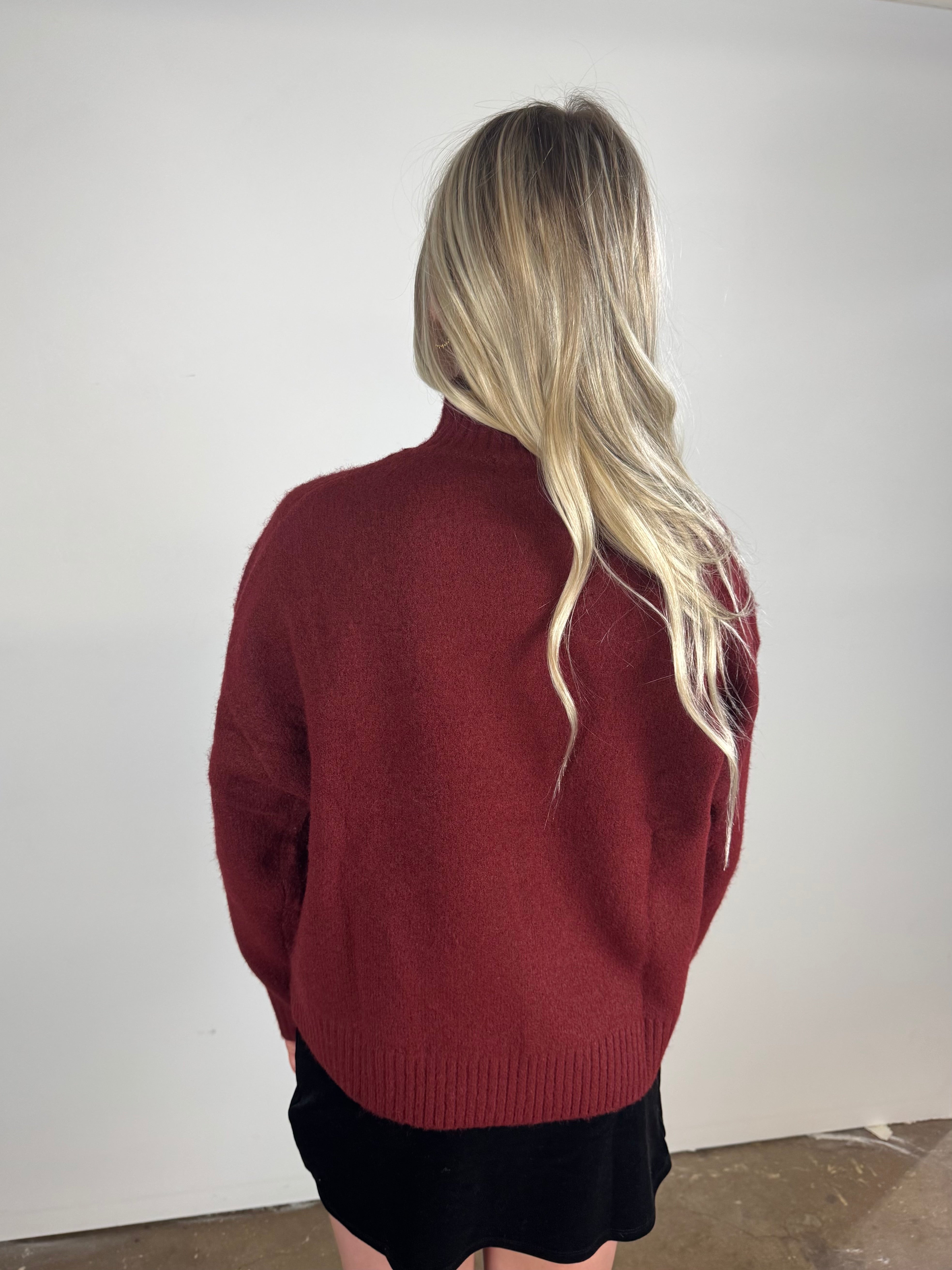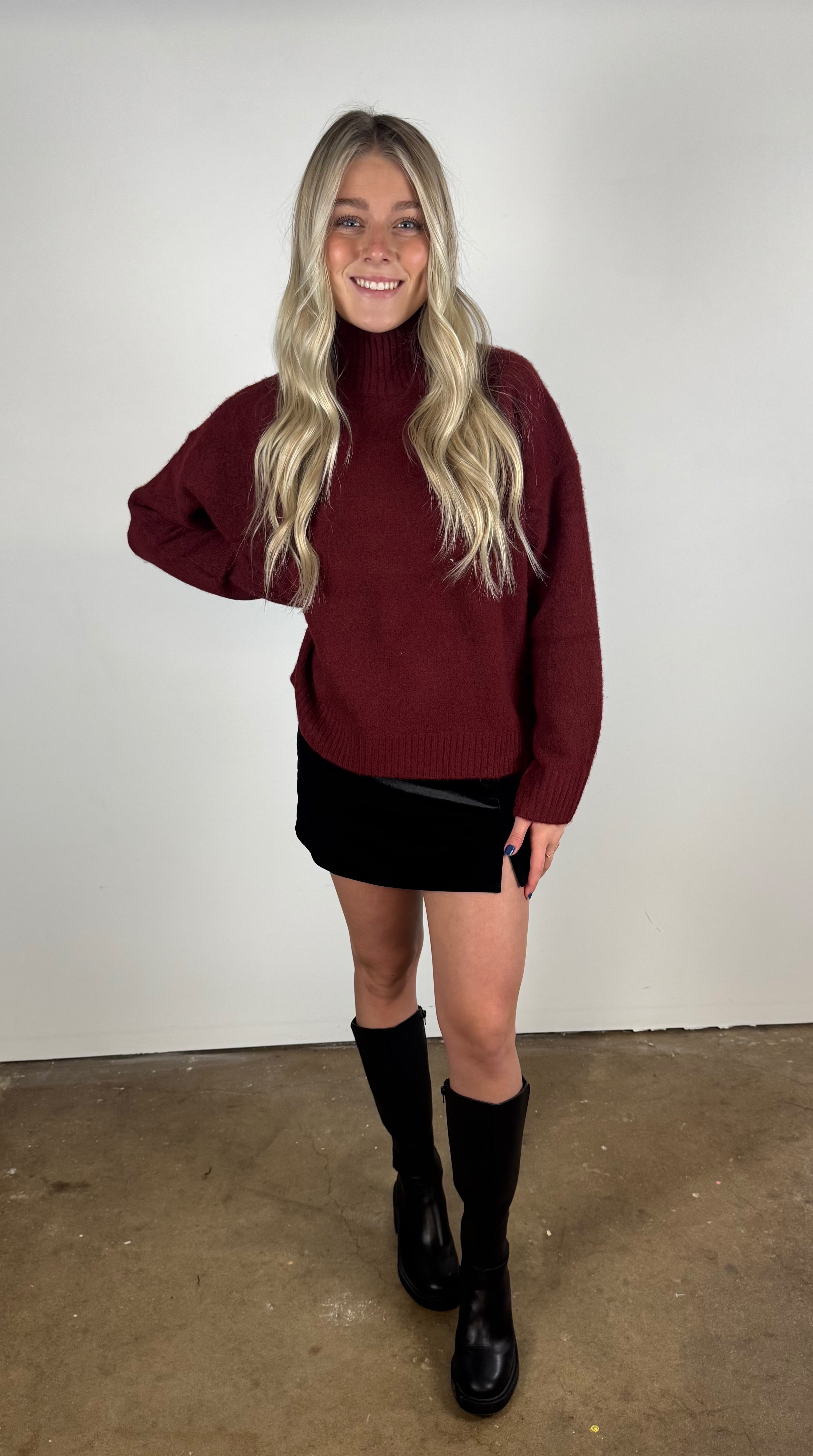 This rich burgundy turtleneck sweater brings effortless elegance to cooler days. With its soft knit, relaxed silhouette, and timeless color, it instantly elevates any outfit—from skirts and boots to your favorite denim—making it a must-have staple for fall and winter wardrobes.