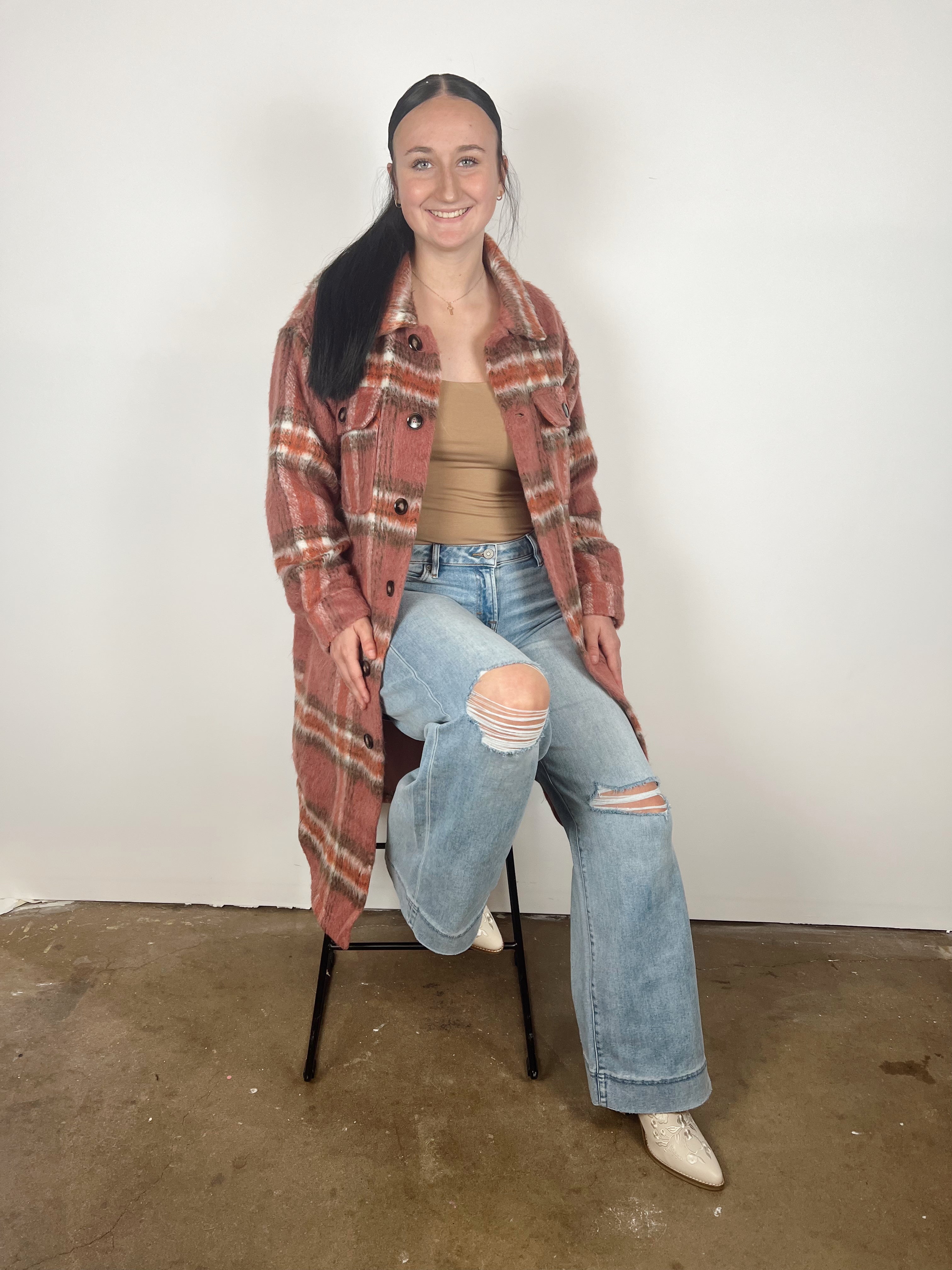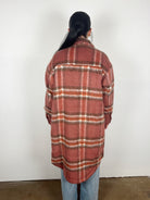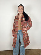 This long plaid shacket blends warmth and style effortlessly. Featuring a rich rust and cream plaid pattern, soft brushed fabric, and a relaxed longline fit, it’s the perfect layer for chilly days. Designed with button-front closure, chest pockets, and a cozy mid-weight feel, this piece adds a touch of laid-back charm to any fall outfit — from casual jeans to fitted basics.